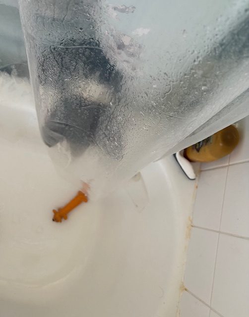 Leela continues to bring me toys in the shower. She comes in and out a few times to retrieve them once she has dropped them in.
