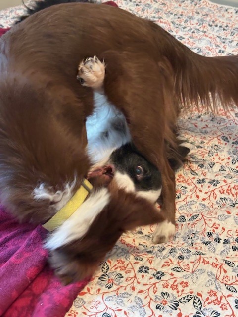 Jack: The first hour or so she didn’t like me and showed her teeth but I was savvy enough to give her space. Then she wanted to wrestle with me and I liked that after a few days. Now I like to chase her when she is fetching the frisbee.